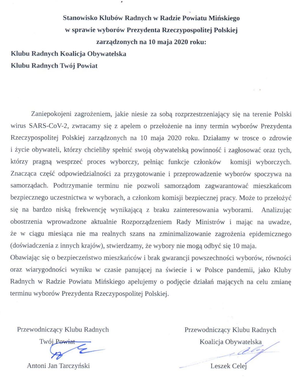 Bardzo ważnym wydarzeniem na tle epidemii są wybory prezydenckie zarządzone na 10 maja. Tu również postanowili zadziałać radni i podczas spotkania przeprowadzonego w formie wideokonferencji zaproponowano przesłanie do Rady Ministrów stanowiska przewodniczących klubów radnych mówiącego o zagrożeniach, jakie niesie za sobą przeprowadzenie tych wyborów w czasie epidemii koronawirusa. W trosce o bezpieczeństwo mieszkańców powiatu mińskiego i mając na uwadze wątpliwą równość i wiarygodność wyników wyborów, radni dwóch klubów uznali, że zasadną byłaby zmiana terminu wyborów prezydenckich. Niestety, zarówno apel dotyczący badań, jak i stanowisko w sprawie wyborów, nie spotkały się z akceptacją klubu radnych Prawa i Sprawiedliwości i przewodniczący Piotr Stępień ich nie podpisał.